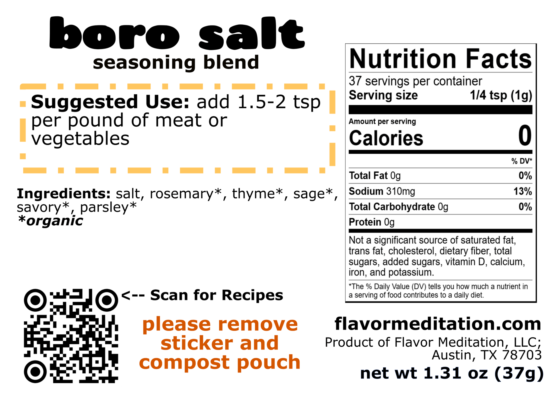 Suggested use: 1.5-2 tsp per pound of meat or vegetables