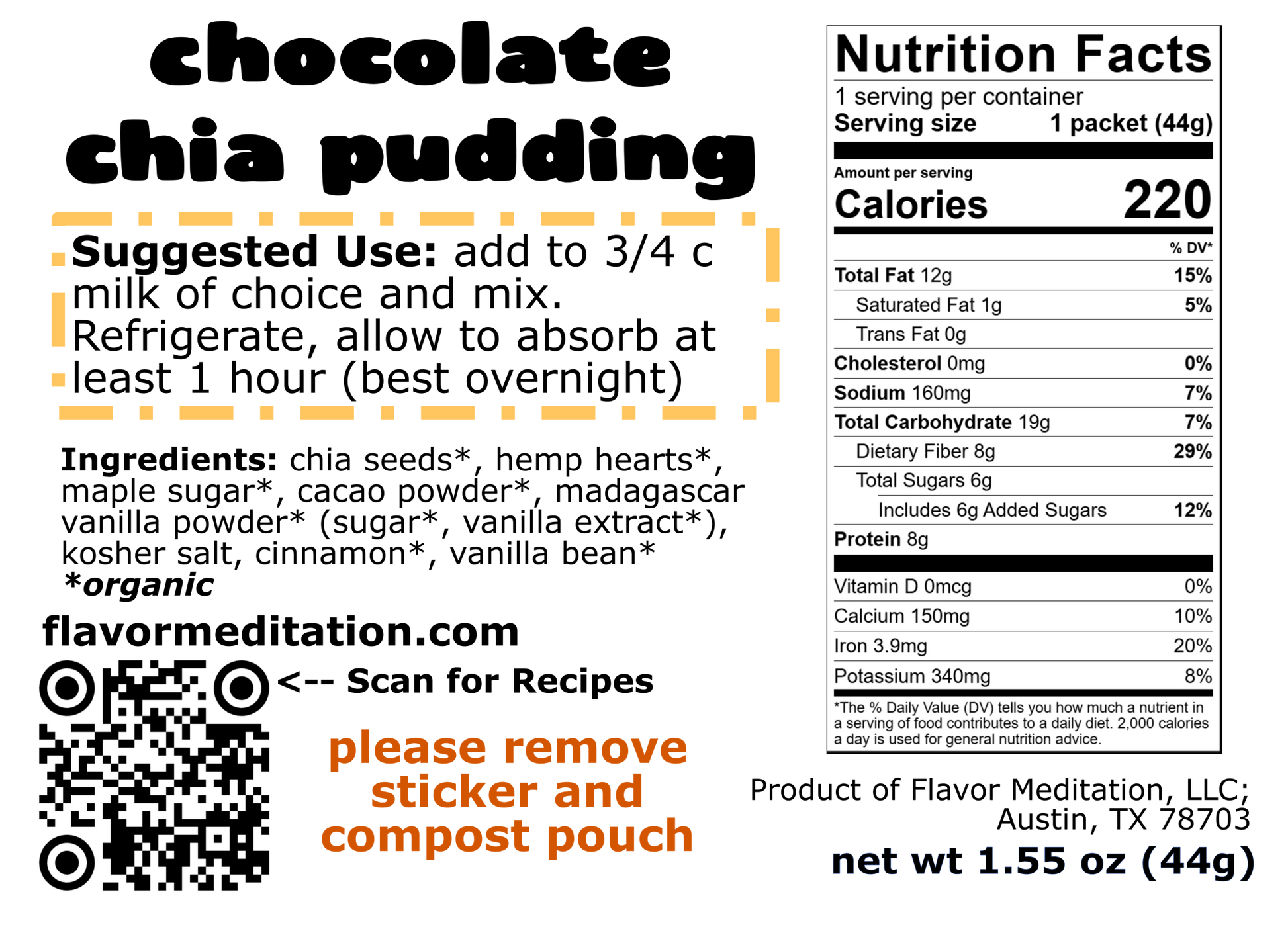 Instructions: add full packet to 3/4+ c milk of choice and mix. Refrigerate, allow to absorb at least 1 hour (best overnight)