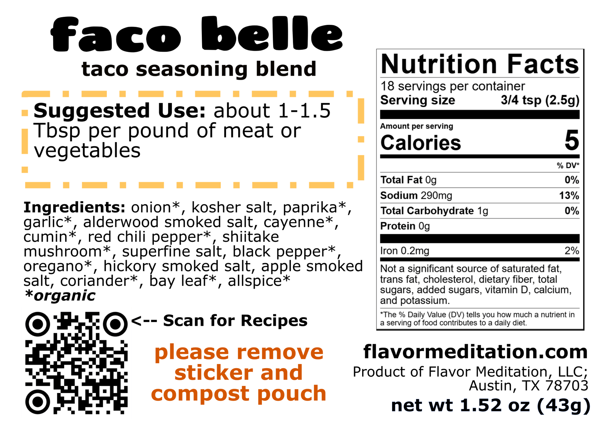 Suggested use: 1.5 Tbsp per pound of meat / beans or 1 Tbsp per pound of vegetables