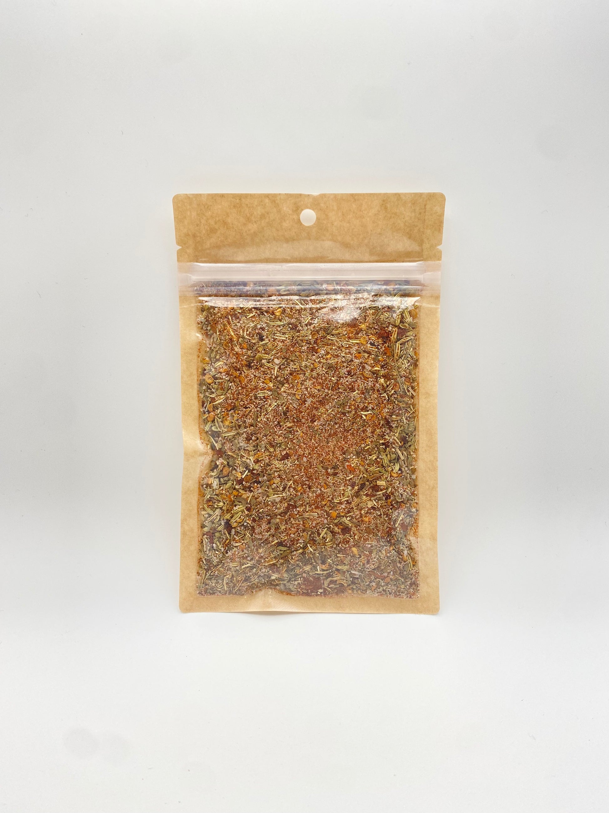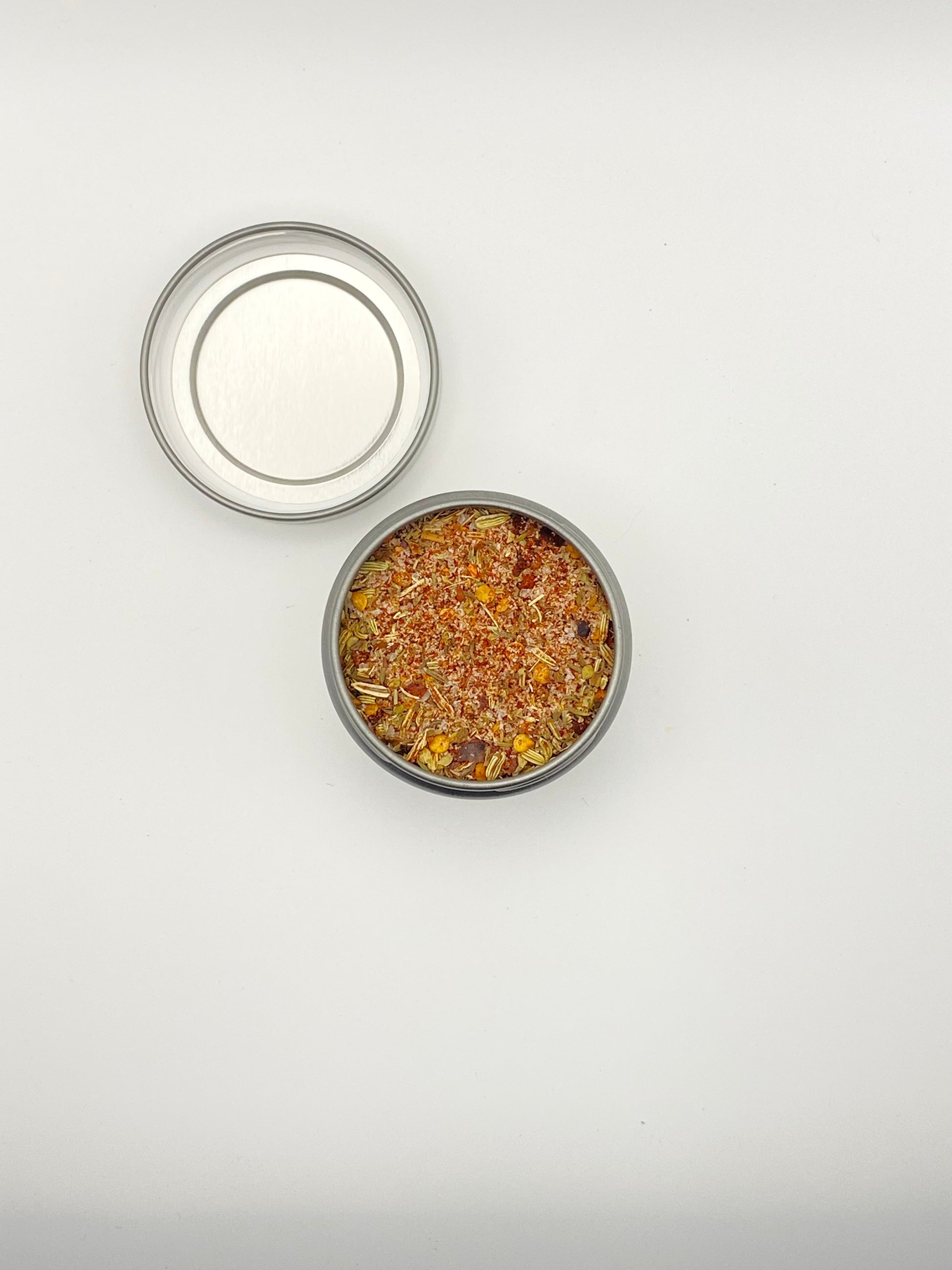 Ingredients: salt, paprika*, garlic*, fennel*, crushed red pepper*, thyme*, basil*, oregano*, rosemary*, marjoram*, savory*, sage*