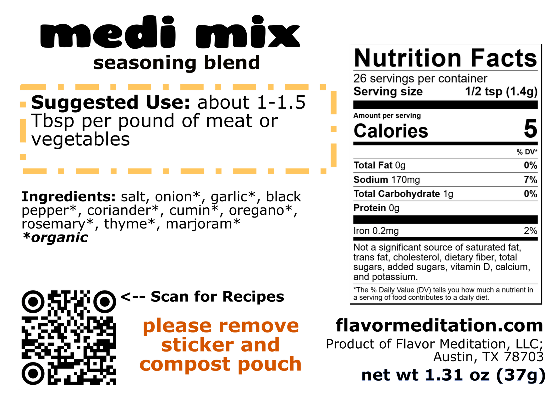 medi mix is a punchy, aromatic blend of herbs and spices. Use it to season grilled meats, toss it on roasted veggies, or sprinkle it over feta and olives. Fast, flavorful, and fantastic! Plus, makes an insanely delicious vinaigrette that enhances any savory dish