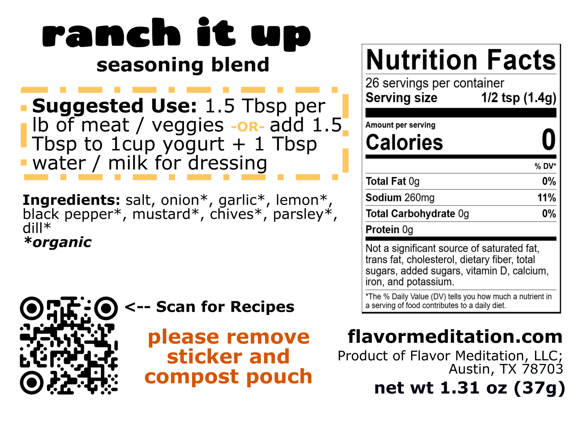Suggested use: 1.5 Tbsp per pound of meat / veggies -OR- add 1.5 Tbsp to 1cup yogurt + 1 Tbsp water / milk for ranch dressing